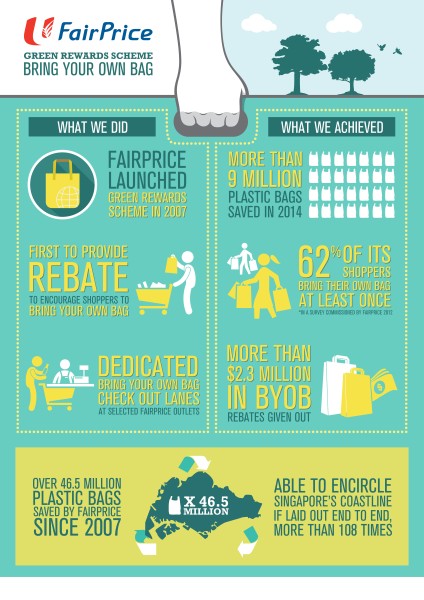 FairPrice first launched the FairPrice Green Rewards Scheme in 2007. The aim of doing so was to urge shoppers to reduce their usage of plastic bags. Also, FairPrice has given out more than $2.3 million in rebates – resulting in an estimated 46.5 million plastic bags saved. Since launching this initiative, FairPrice has seen an an annual 10 percent average increase on plastic bags saved at their stores – with the highest number being saved last year.