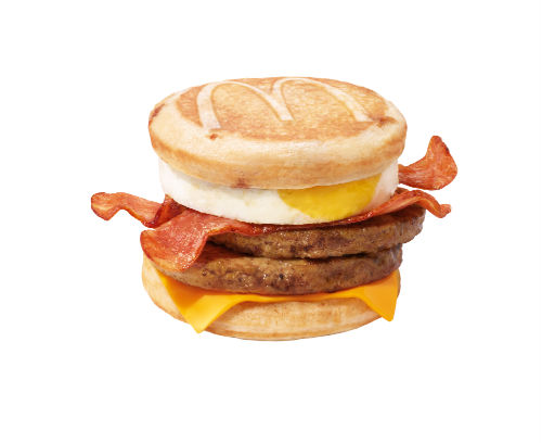Or you can double your enjoyment with the all-new McGriddles® Stack ($6.20) which comes with two chicken sausage patties packed between griddle cakes along with melted cheese, a sunny-side-up egg and crispy chicken bacon.