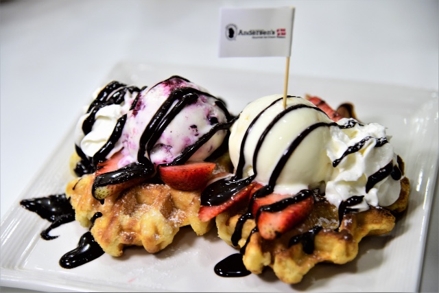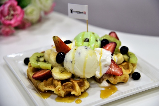The waffles can be customised with a variety of toppings, such as fruits like bananas and berries, confectioneries such as chocolate rice, marshmallows, rainbow sprinkles and a variety of sauces. All are finished with a choice of Andersen’s premium ice cream.