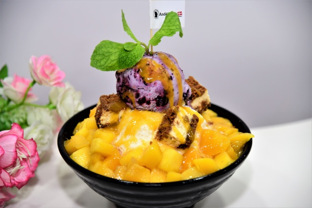 For the Bingsu, this is a popular Korean dessert made with shaved ice and topped with fruits and ice cream.