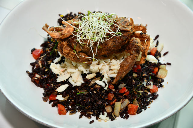 I picked the Crab Kerabu, which was crispy soft-shell crab served on a bed of organic jasberry rice and topped with crab meat, kaffir lime and toasted desiccated coconut.