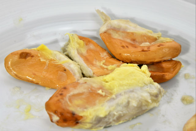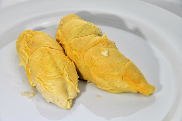 This durian had an intense yellow colour and in the portion that we received, some fruits had the seed visible and the seeds are typically flat.