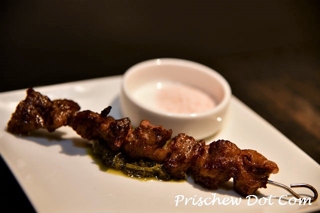 The third course was the grilled beef skewer, which is made using beef taken from between the ribs. This is prepared with a chimmichurri sauce that consisted of red vinegar, olive oil and cilantro and is then served with Himalayan pink salt on the side.