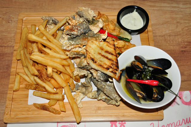 As the name of the dish indicates, this is a seafood platter consisting of crispy fish skin, fried calamari, garlic butter mussels, straight cut fries, char grilled bread and tartar sauce.