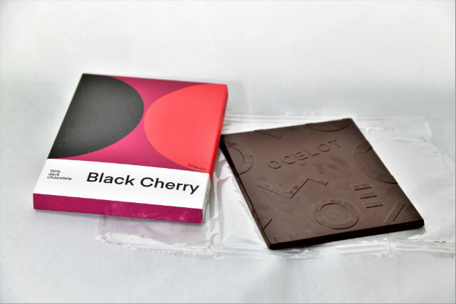 I received Ocelot’s 70% Dark Black Cherry chocolate which consists of sweet black cherries enveloped in smooth, rich, dark chocolate, as described on the packaging.