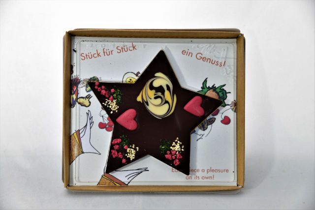 This is a chocolate star made with high-percentage fine flavour chocolate and filled with a festive cinnamon mousse and decorated with two sweet raspberry chocolate hearts.