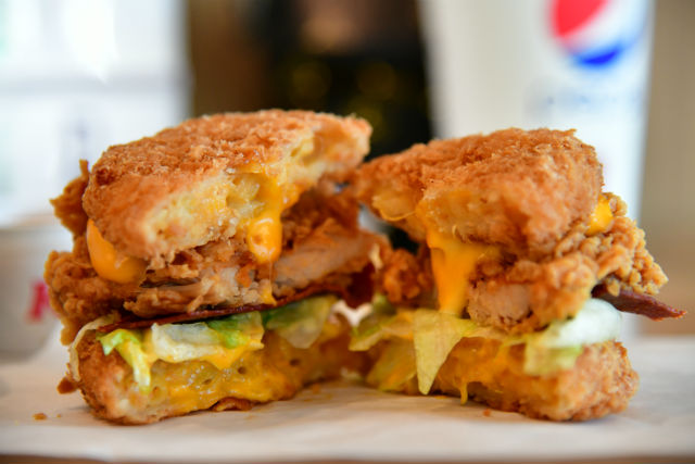 And layered between these patties is KFC’s signature Zinger fillet, and then stacked with crispy turkey bacon, lettuce and finally, drizzled with KFC Cheese Sauce.