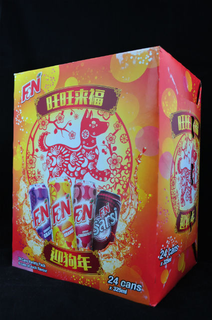 In the F&N Variety Pack, the cans are decorated in vivid shades of red and yellow, both of which are lucky colours during Chinese New Year. As well, an artwork of a dog is also displayed on the variety pack, complete with the appropriate festive greetings.