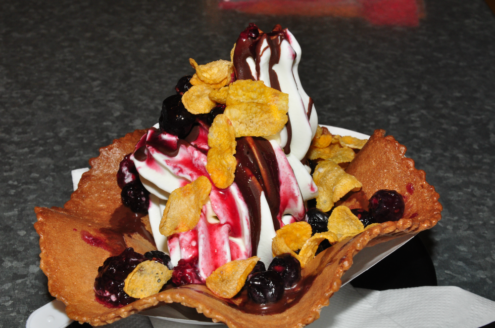 - Adventure in a Cone ($3.50) – A vanilla soft serve topped with coconut flakes and strawberry sauce. This is served on a chocolate waffle cone, and is exclusive to Marine Cove.