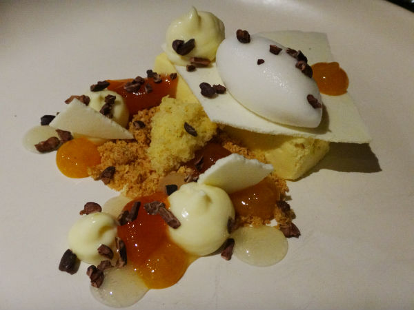 This is an a-la-carte dessert, with lemon, cocoa nibs and white chocolate flavours. It comes in the form of a cheesecake, with a scoop of vanilla white-chocolate ice cream on the top.