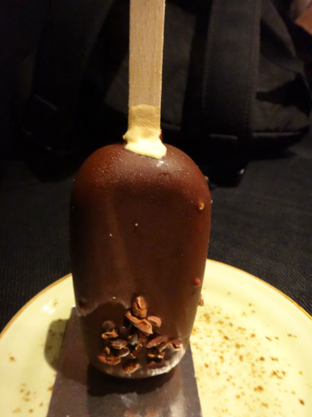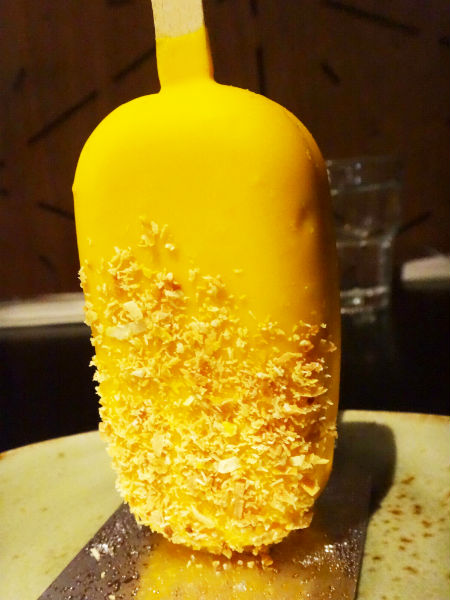 A layer of vanilla flavoured ice cream and another layer of a mango flavoured one, were encased within a chocolate coating infused with mango essence, for this dessert.