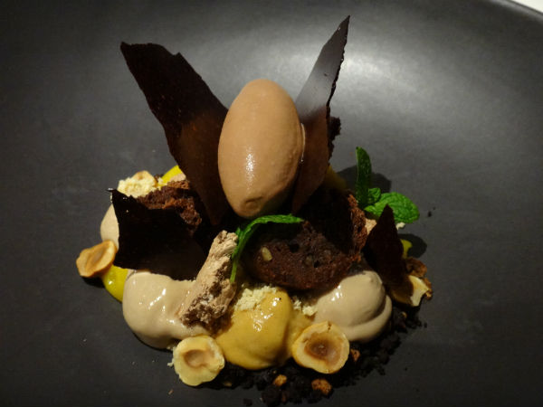 This is a dark chocolate-based a-la-carte gateaux dessert consisting of jasmine, hazelnut, caramel and orange flavours and is served with a small scoop of ice cream on the top.