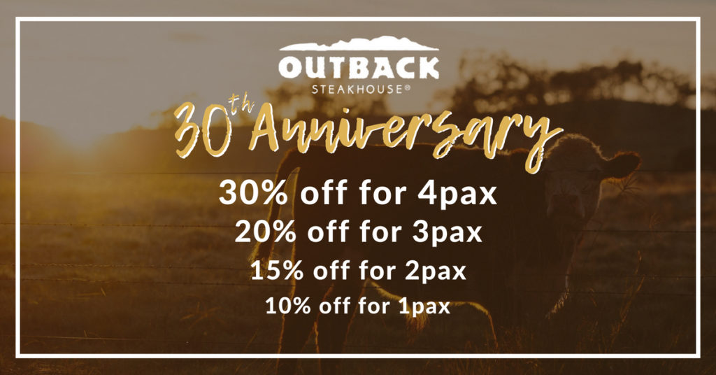 So this means that for the entire months of August and September, with no minimum spending, you can enjoy up to 30 per cent off when you feast with your loved ones at Outback Steakhouse.