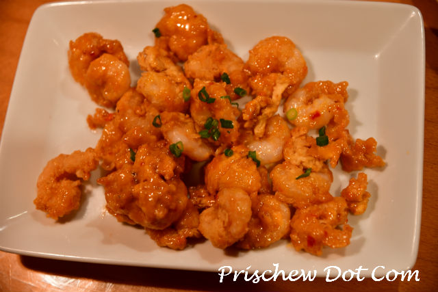 The Crispy Volcano Shrimp is described on the menu as being crispy shrimp tossed in a spicy sriracha aioli sauce and garnished with spring onions.