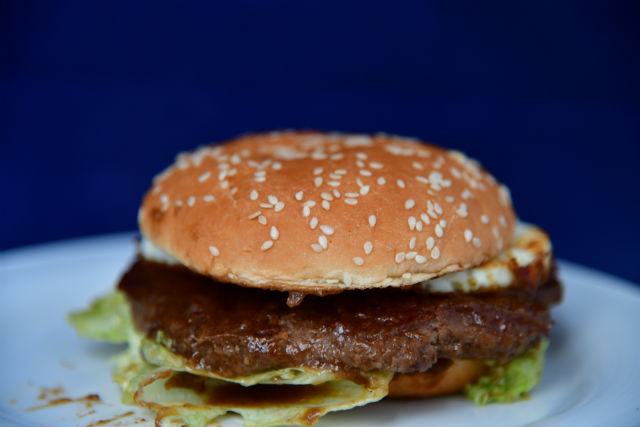 Laid atop a layer of whole lettuce leaf, the fragrant Angus beef patty is then topped with a tender fried egg and a bed of fresh sliced red onions and grilled caramelised onions, served between two halves of a sesame seed bun.