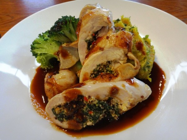 I thought this dish was really delicious. The chicken breast was moist and tender, and cooked to perfection. As well, ricotta cheese was added and gave more moisture to the meat. The spinach also gave the chicken an interesting and unique taste that really appealed to me. The accompanying sweet potato mash was a delightful change to the usual potato version