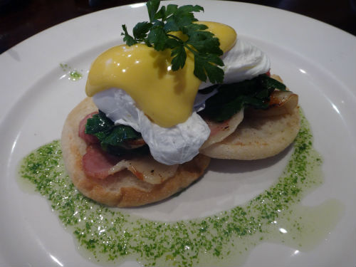This was served with two huge poached eggs placed on top of two halves of an English muffin. There was bacon and spinach underneath the eggs to add some bulk and colour to the dish.