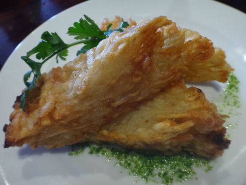 We ordered these hash browns as a side dish. They were served on a plate with three pieces of hash browns arranged nicely with a piece of parsley for decoration.