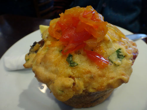 The two halves of the muffin were served on a plate together with a very generous slab of butter. I found the taste really unusual and very interesting. I could taste a mixture of carrots and spring onions in the muffin, plus a few other ingredients that I could not really detect. After I had gotten over the initial uniqueness of the muffin taste, I began to find it rather delicious.