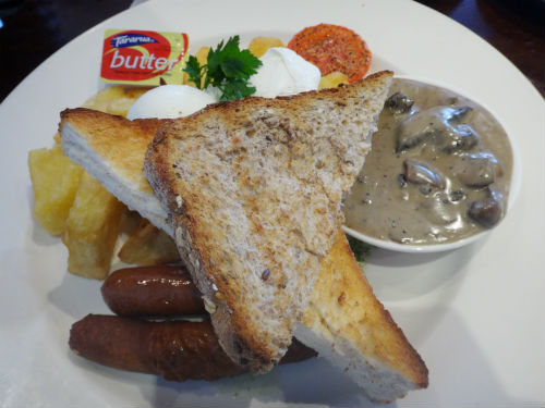We ordered a Power breakfast set, comprising of sausages, bacon, eggs, toast and mushroom sauce and also eggs benedict, their delicious homemade hash browns and a savoury muffin.