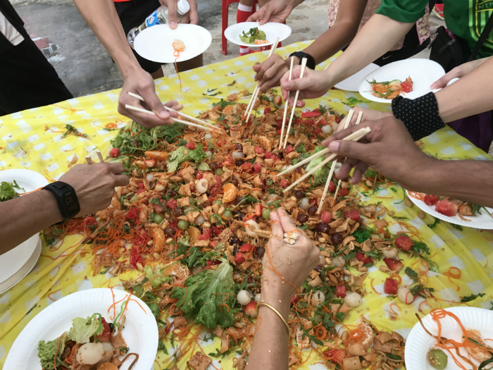 After all the photo taking was done, a huge mess erupted when we tossed it. In fact it was so bad… that it seemed as though a bulldozer had literally made its way right through the YuSheng! I’m sure that there must have been plenty of runner sweat mixed into the salad too!