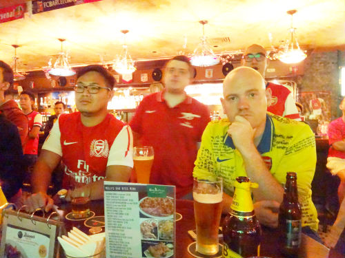 Peter’s travels have brought him now to Singapore, where he caught the live Arsenal v Man United game (3.45am this morning) at Molly Roffey’s Irish Pub – home to the Arsenal FC supporters club in Singapore.