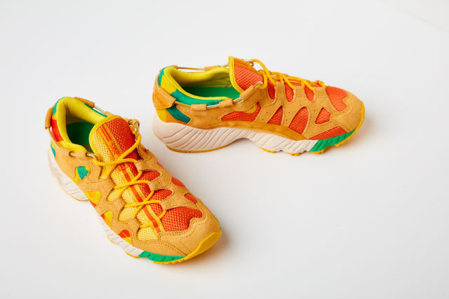 The heel design is inspired by ‘himawari’ or ‘sunflower’ in Japanese and the rubber sole and knit upper comes in shades of yellow and orange, to mimic the range of tones in a sunflower.