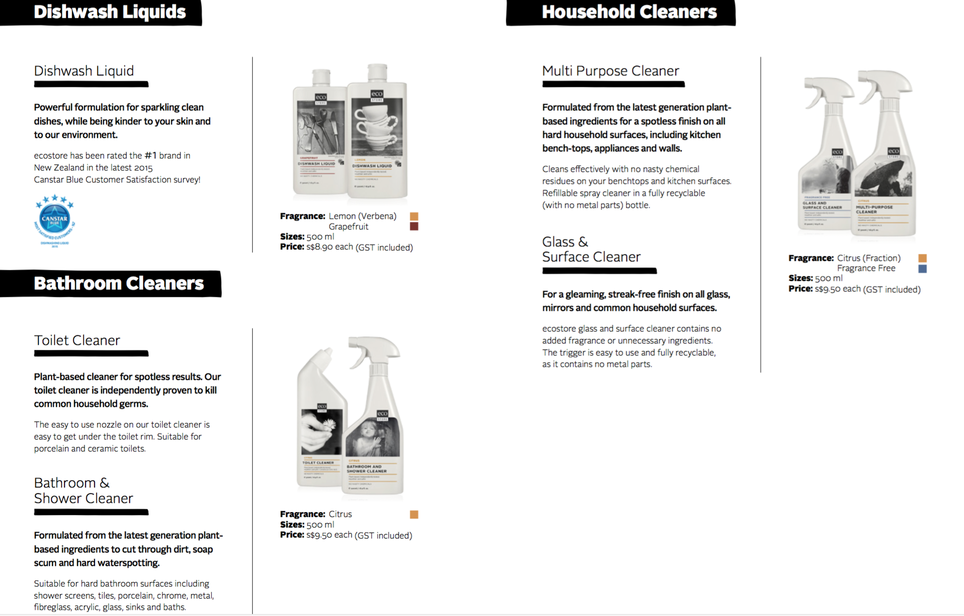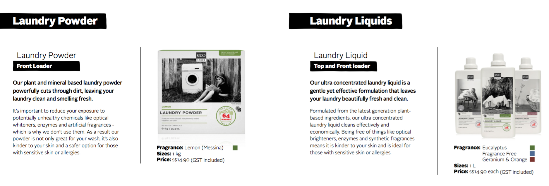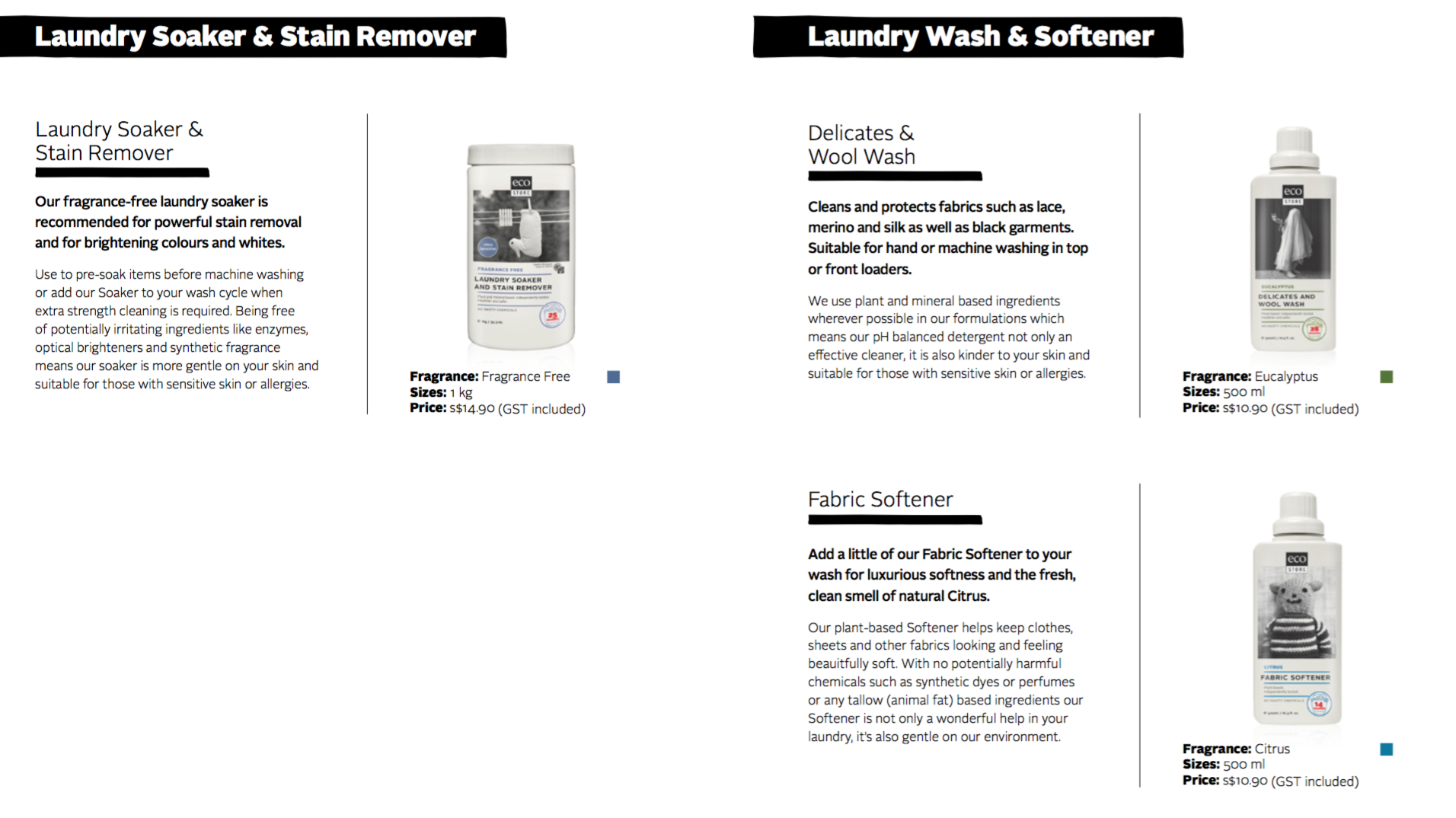 See below for a selection of the products that EcoStore has available and which ones you can purchase at NTUC FairPrice and Cold Storage outlets in Singapore.