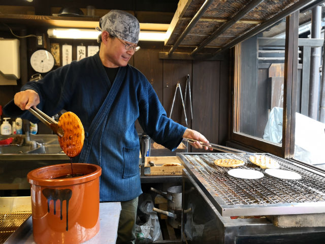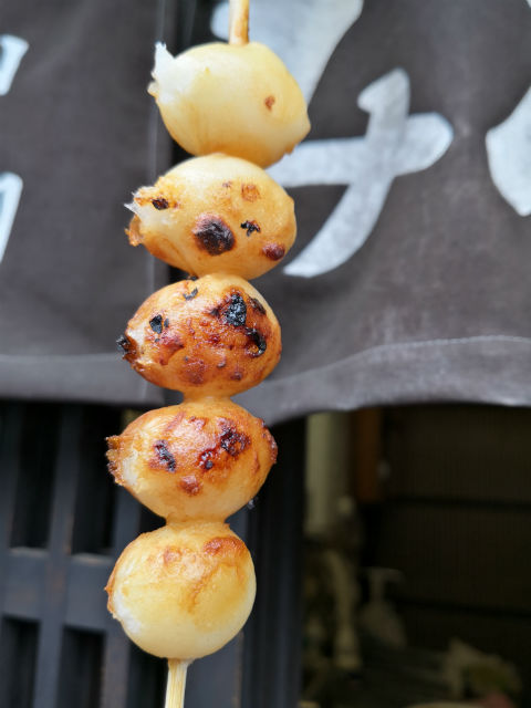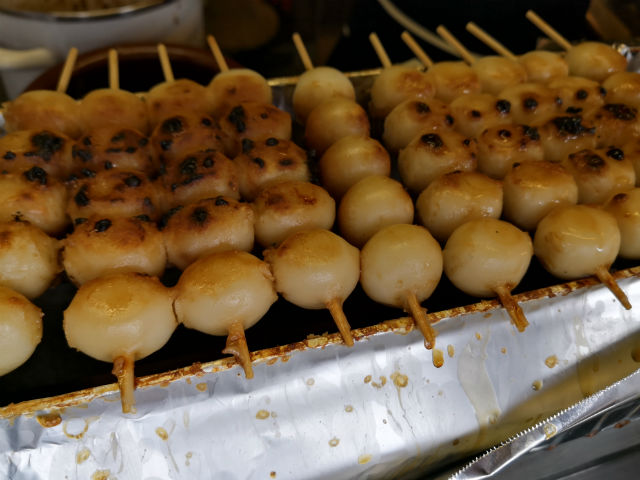 This is a traditional snack where mochi rice is formed into small, round dumplings and then covered in soya sauce before it was grilled.