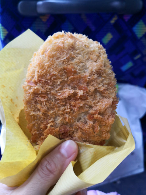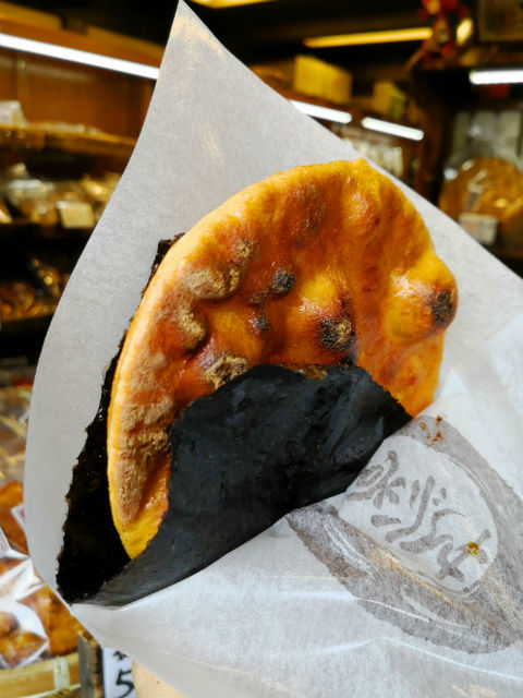 I bought myself one of these to eat, and it was really yummy. The rice cracker was coated with soy sauce and decorated with a piece of seaweed and was probably about the size of my face.