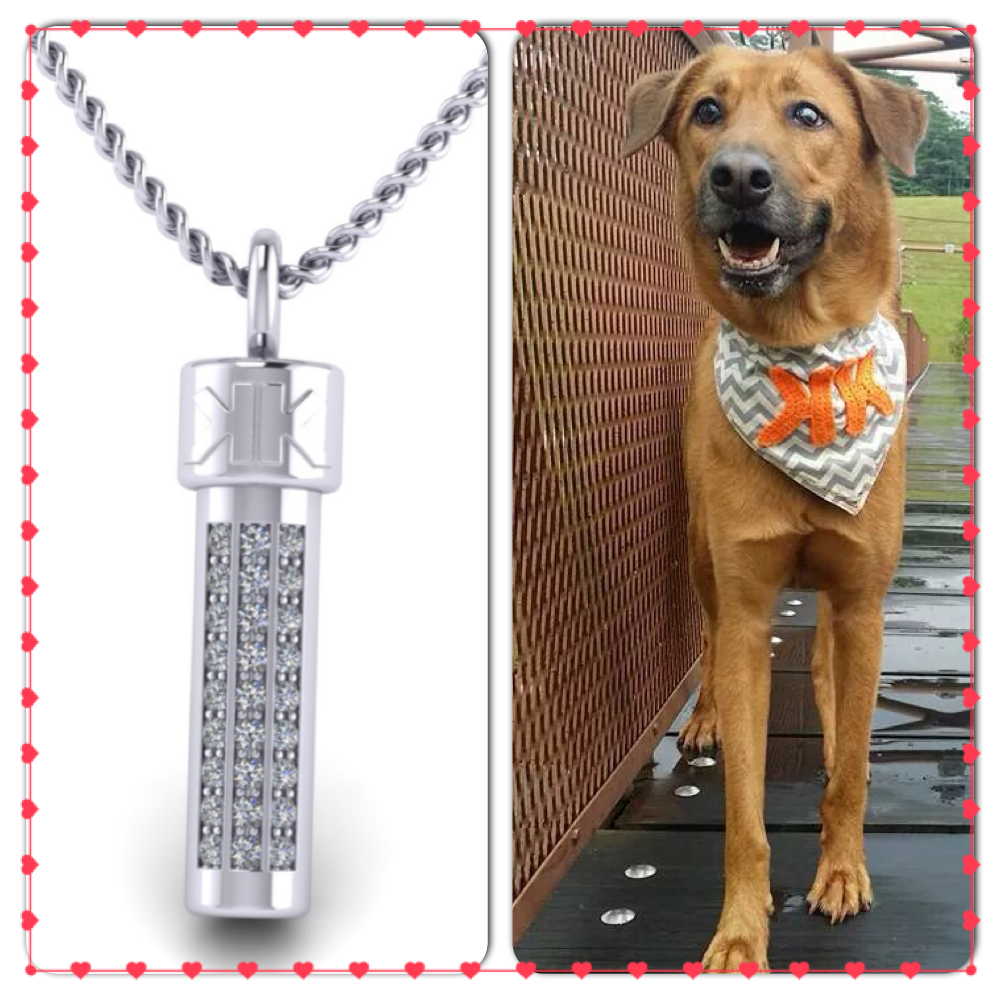 A piece of jewellery (left) created to commemorate the client’s pet dog (right) which passed away, age 27. (Credit: JannPaul).
