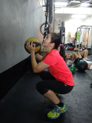 The second part of our class consisted of alternating reps of wall-balls (squatting, followed by throwing a weighted ball against the wall) and ring rows (a horizontal pulling exercise that strengthens the upper body muscles).