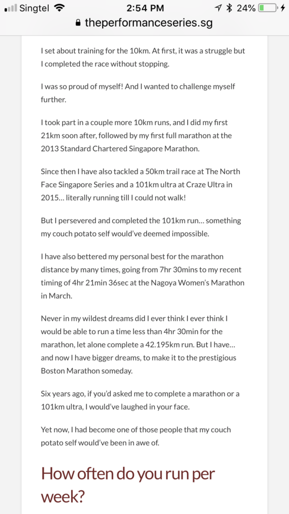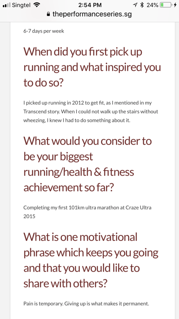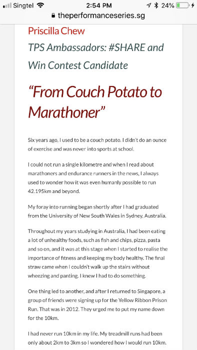 There was nothing to lose by participating in the contest and at the same time I could get a chance to win S$1,000, so I decided to submit my personal story about my transformation from a couch potato to a marathoner and ultra-runner.