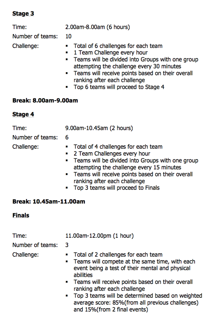 Here is more information about the timetable and the format of the Puma 24 Hour Trainathlon in Singapore. (See Tables below)