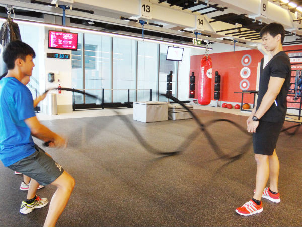 To build strength in our arms, we held onto an incredibly heavy rope, termed as a “battle rope” while doing alternate waving arm movements, and maintaining a squat position at the same time. We had to do this for one full minute.
