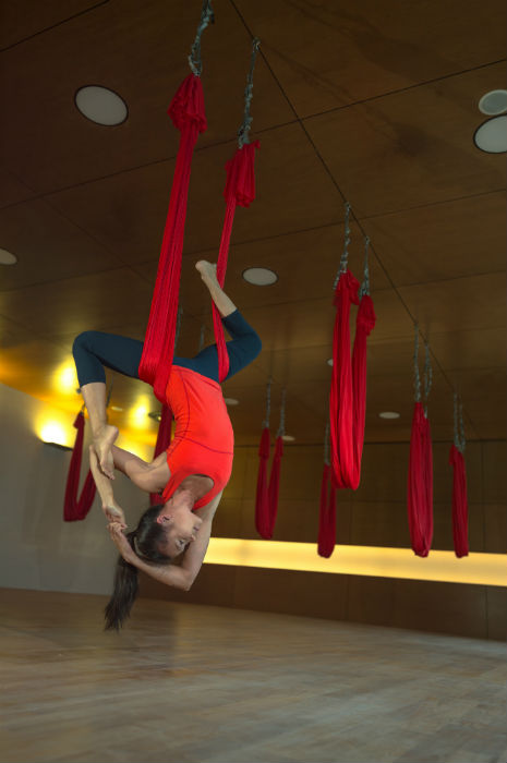 The anti-gravity yoga takes place on silk hammocks suspended in the air, while the hot yoga takes place in a heated room.