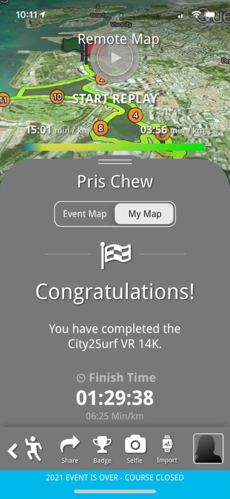 I clocked the 14km on Sunday 17th October, completing the distance in one go around Singapore’s Marina Bay Area.