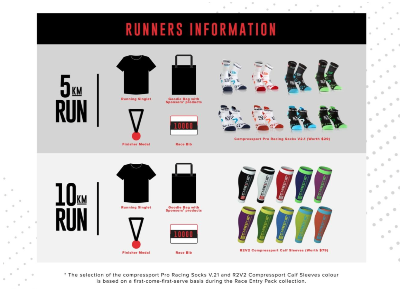 The 10KM runners will get a complimentary CompresSport Calf Sleeves R2V2 inbuilt with the latest Knee Support Technology (worth $79.00).