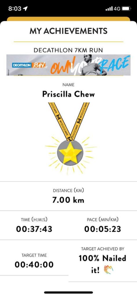 After taking a few photos at the end point, I then slowly jogged back to the Decathlon store for recovery, where I collected my finisher stuff from inside the shop.