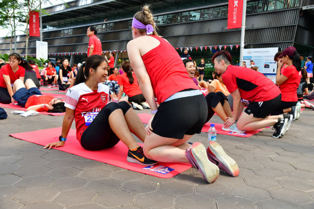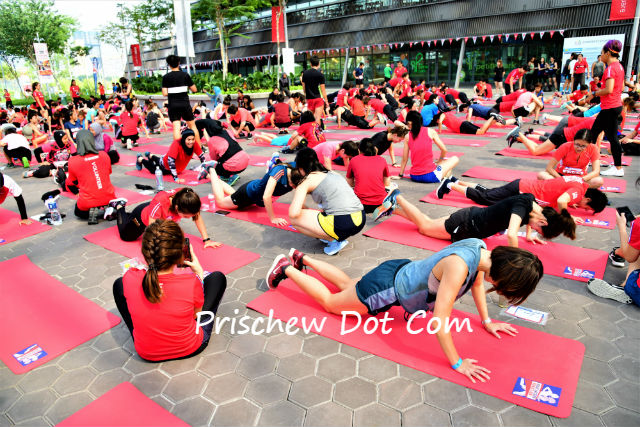 Then three of Singapore’s leading fitness trainers, Natalie Dau, Wany Misban and Roxanne Gan gave demonstrations on the correct form for the Sit Ups and Push Ups before we began at 11am starting with the Sit Ups, pairing up so that somebody could hold down our legs for the Sit Ups and and help to count our reps.
