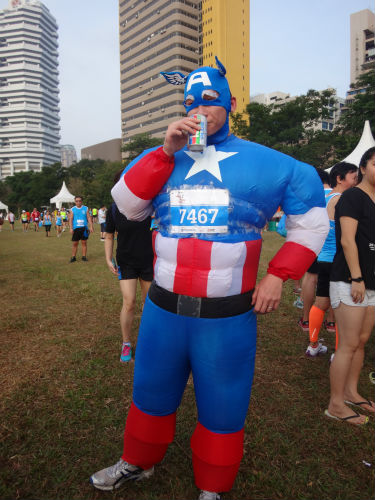 Charles: I proposed to my wife in a minion costume. That was the first time I initially became interested in costumes. So because of that, my friends decided to ask me to take part in this run in one and I thought, why not? So Sebastian loaned me the Captain America costume.