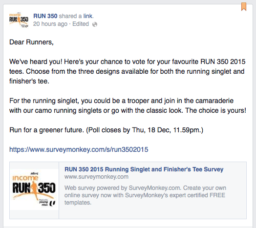 Take part in the survey here. https://www.facebook.com/Run350sg