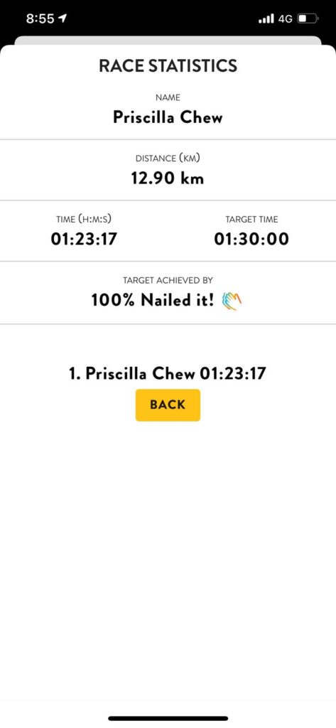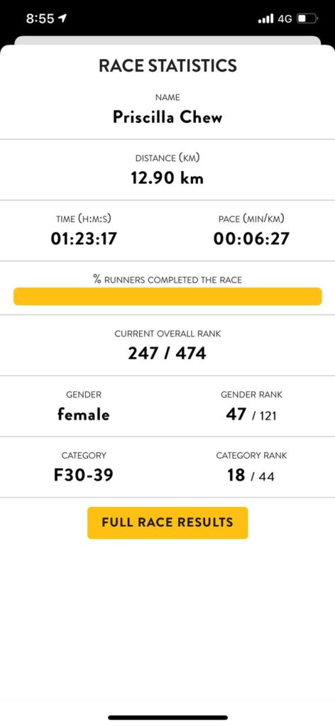 I had entered a modest timing of 1 hour 30 minutes for the 12.9km, but I felt good so I ended up running faster than that.