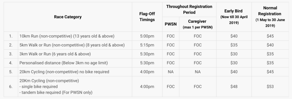 As well, to cater to those who may not be able to run, a new category being introduced in the 2019 event is the 20KM Cycling (non-competitive) where participants can cycle alongside Persons With Special Needs on single bicycles or together with them on tandem bicycles.