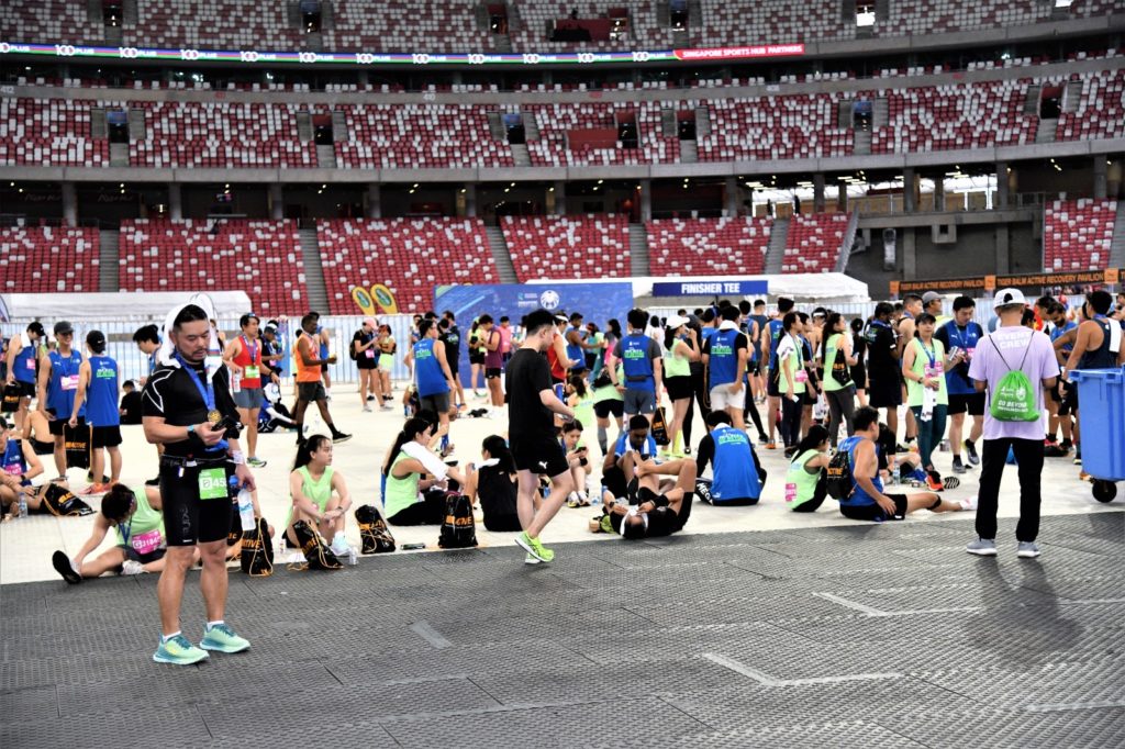 After we exited the stadium, it was made clear to runners that we were not allowed to enter the stadium again. I suppose this rule was put into place by the organiser to prevent overcrowding at the race precinct, with many runners coming back at around the same time. So it does make a lot of sense.