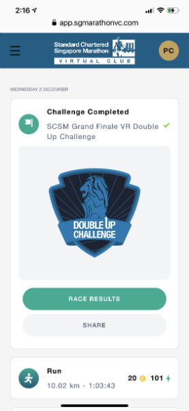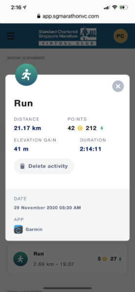 We could choose our own routes. So my 21km was completed around the Marina Bay area, beginning and ending at Stadium.