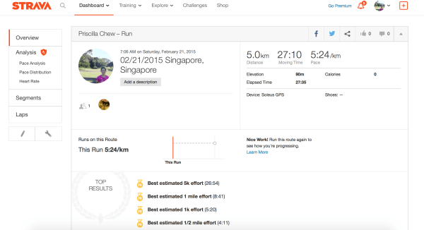 I don’t have the data for Pace Analysis, Pace Distribution and Heart Rate, because these only come with the Premium version of Strava, which you must pay $6.98 per month for.