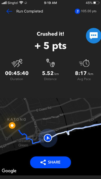 For me, I clocked my run at East Coast Park a couple of weeks after registration had opened, doing the 5.4km in one session. I run regularly so I had treated this as one of my daily run sessions, doing 6.27km in 30 minutes.
