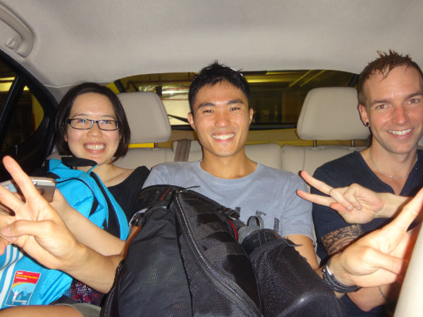 Mok and Russell chilling out after exercise, with Mok's girlfriend Belinda Ooi.
