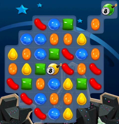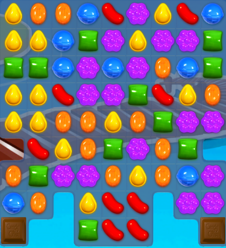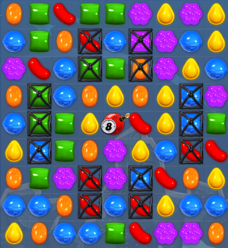 This is another hard and often frustrating level because of the bombs at the top. As a result, you will have to waste some moves just to get rid of them.